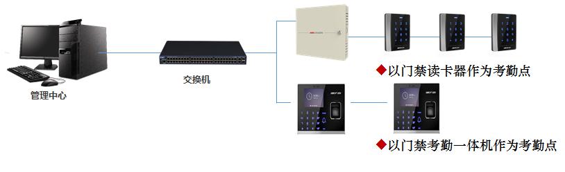考勤管理系统通过综合管理平台实现与数据库的数据交互,包括人员资料、卡片资料、刷卡数据等多种资料。硬件的设置、权限的发放以及人员的卡片发放等由综合管理平台统一完成。系统的架构如下图所示: