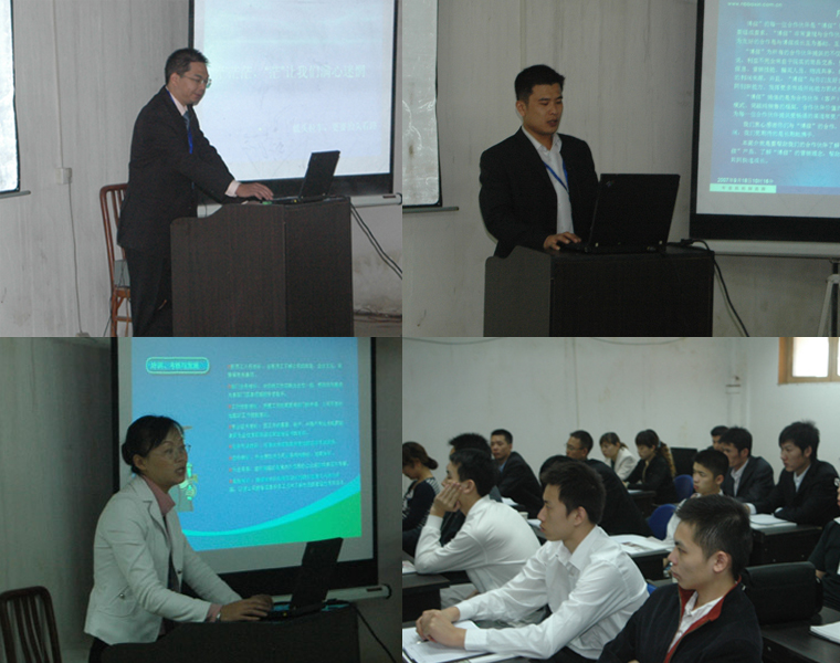 此次培训为期5天,第天第一部分安排为总经理致辞公司总经理王建平主讲,王总从家庭责任社会责任公司责任开始阐述,表达了对科海人的深深期望。第二部分的培训内容为《员工手册》及其公司资质相关内容的培训,由公司办公室主任杨菊主讲,介绍了从公司成立发展过程。其他重点安排了“博信、TDR”产品介绍、及其产品营销相关内容。